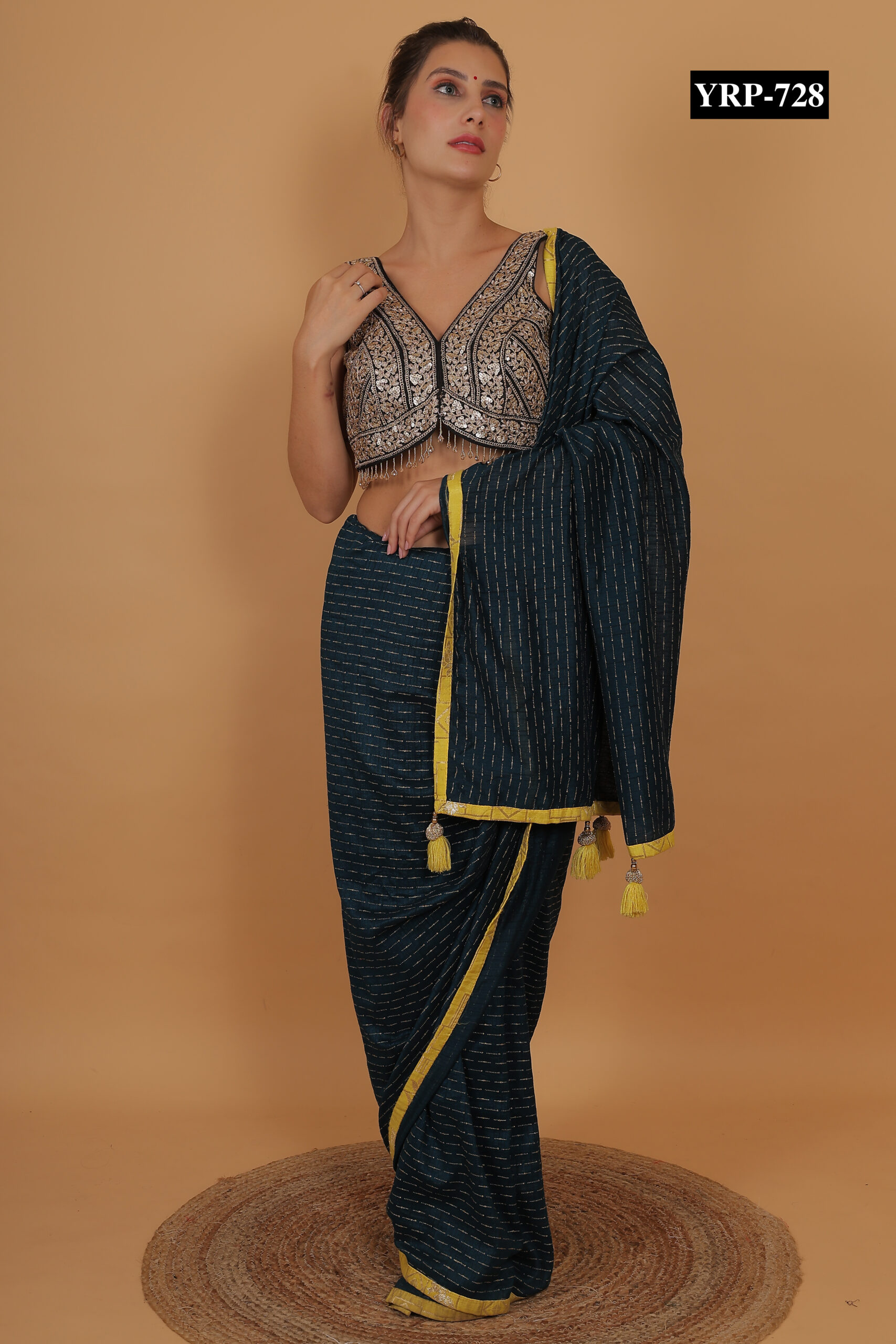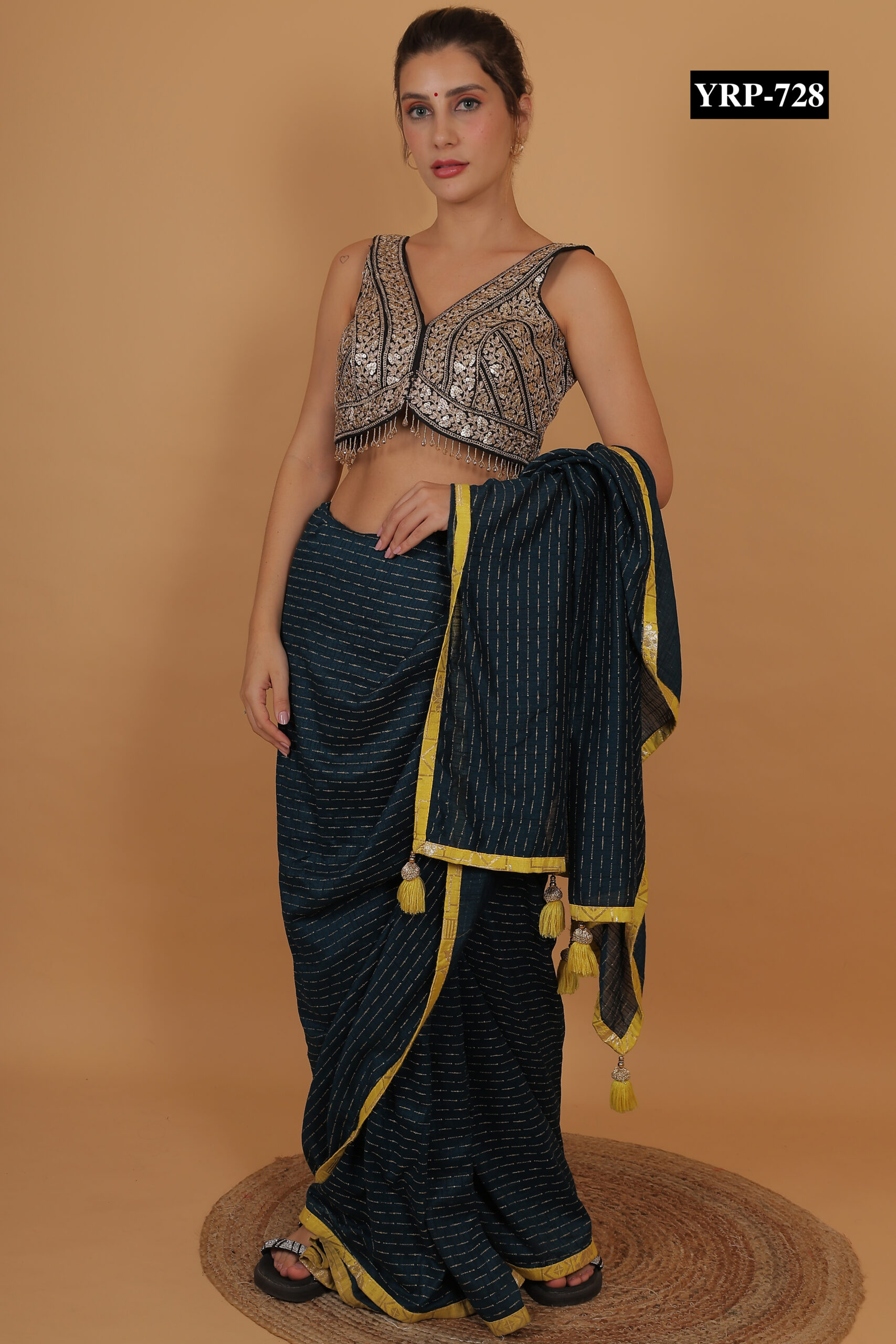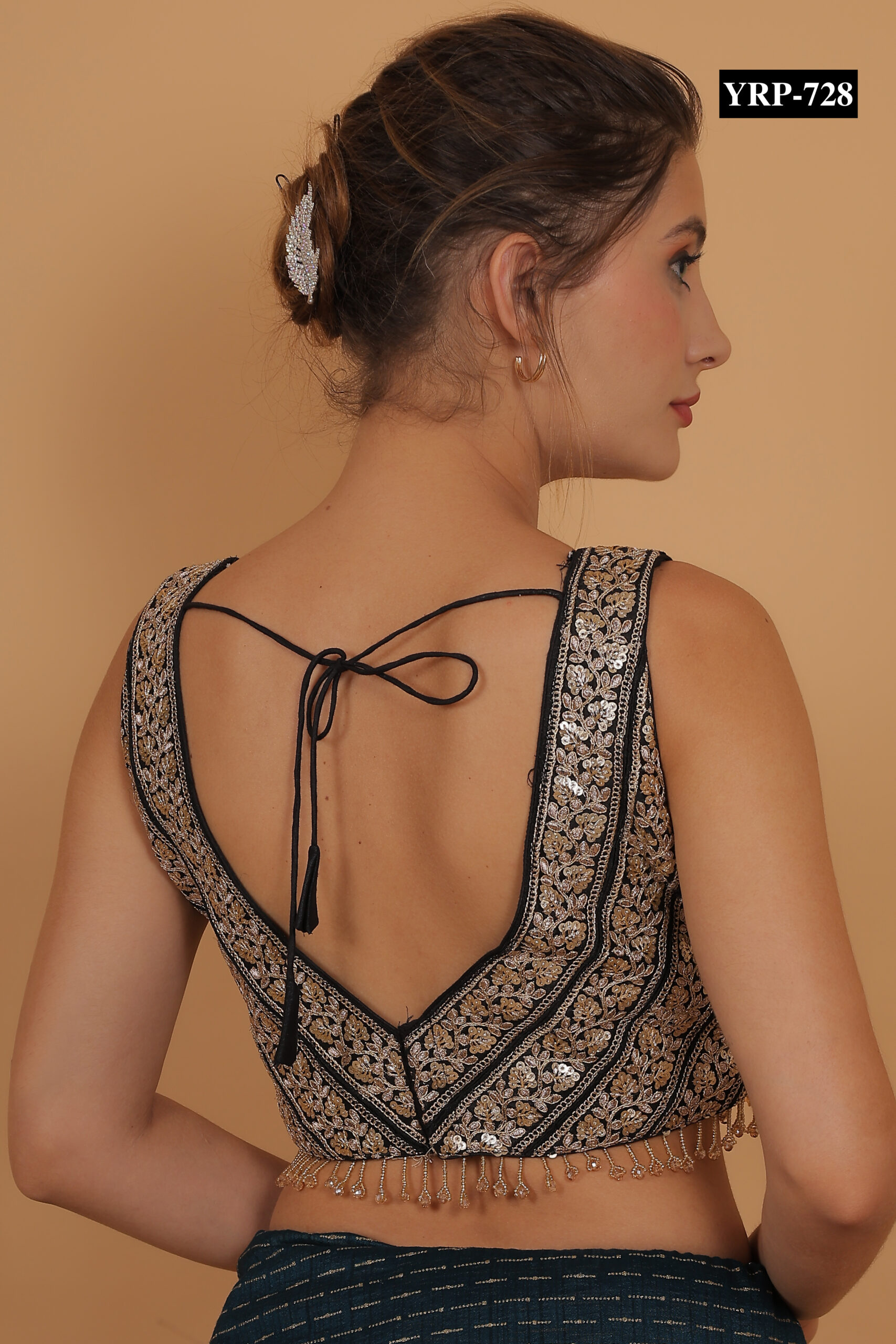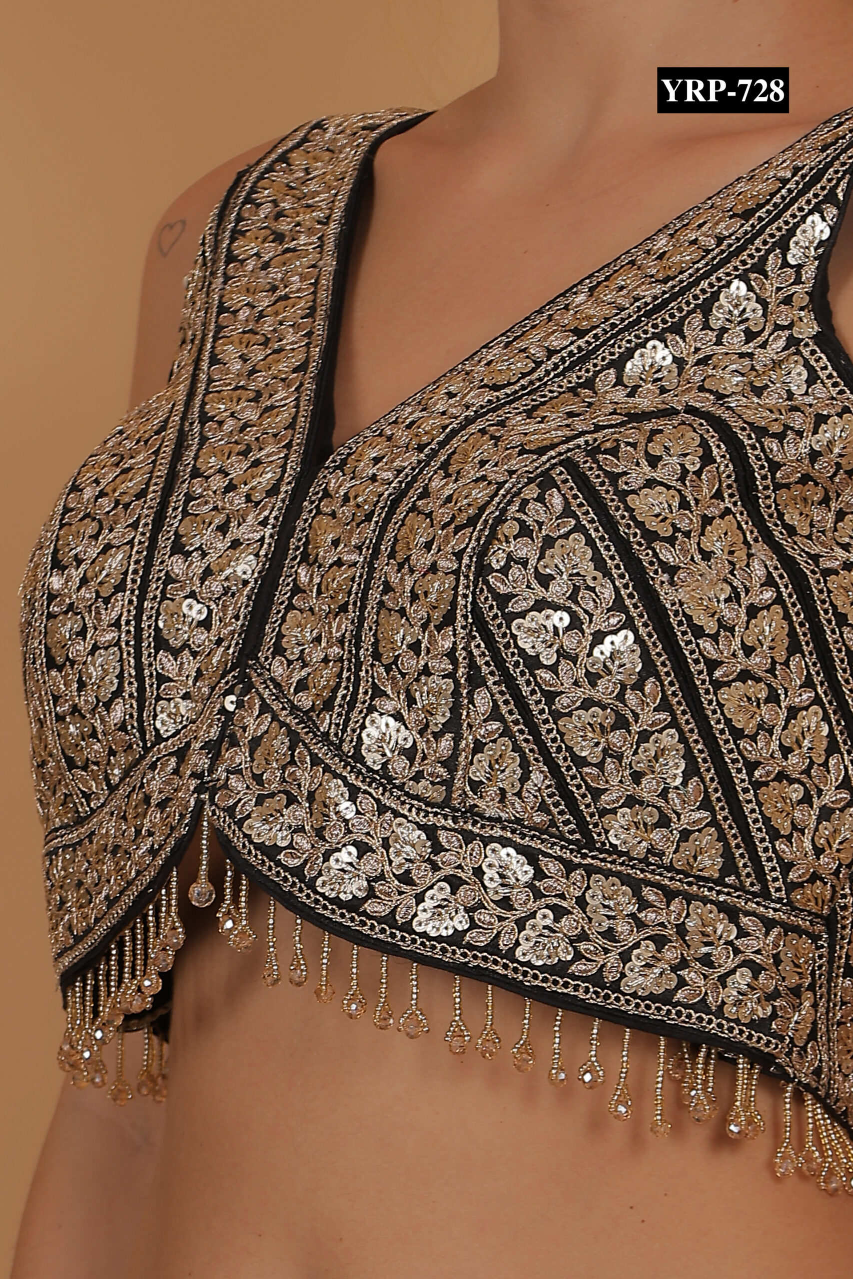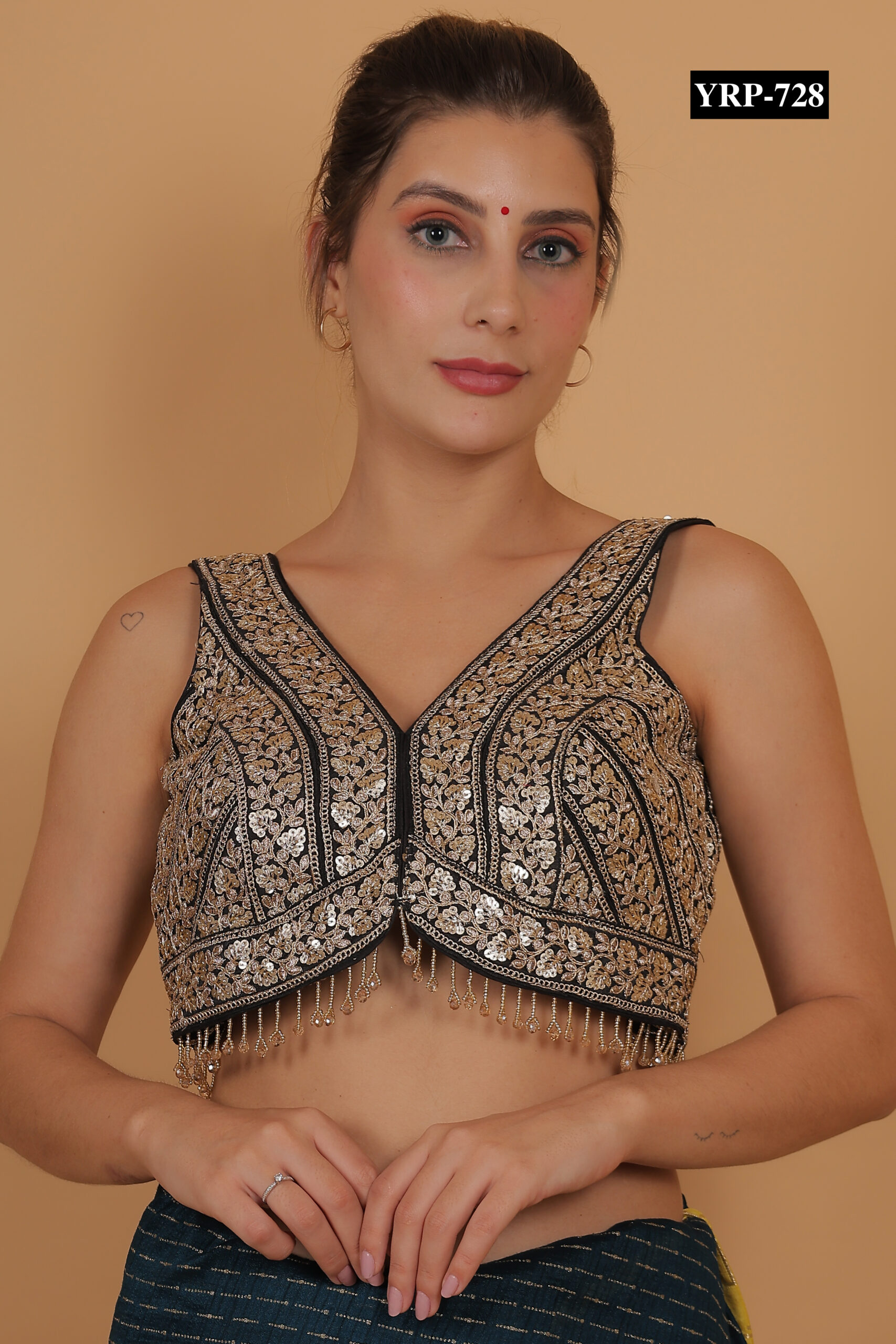 The Black Gold Tassel Top pairs beautifully with contrasting sarees or skirts, such as cream, red, or gold. The golden tassels add subtle shimmer and festive charm to your ensemble. Pair it with statement jewelry for a glamorous effect or keep accessories minimal for a refined, elegant appearance.