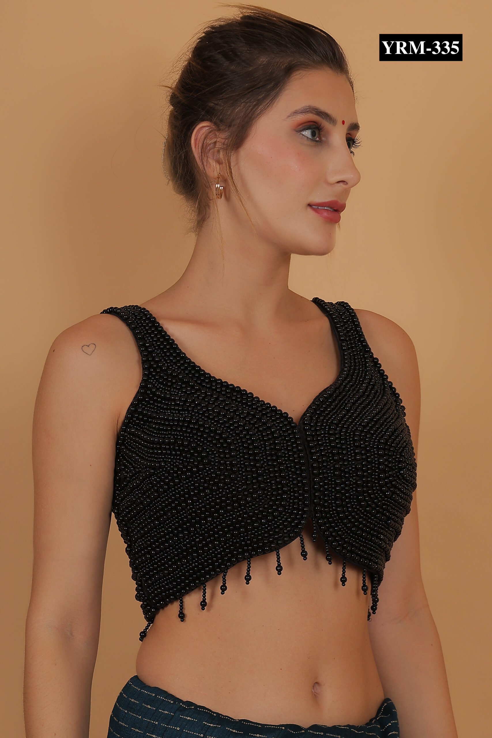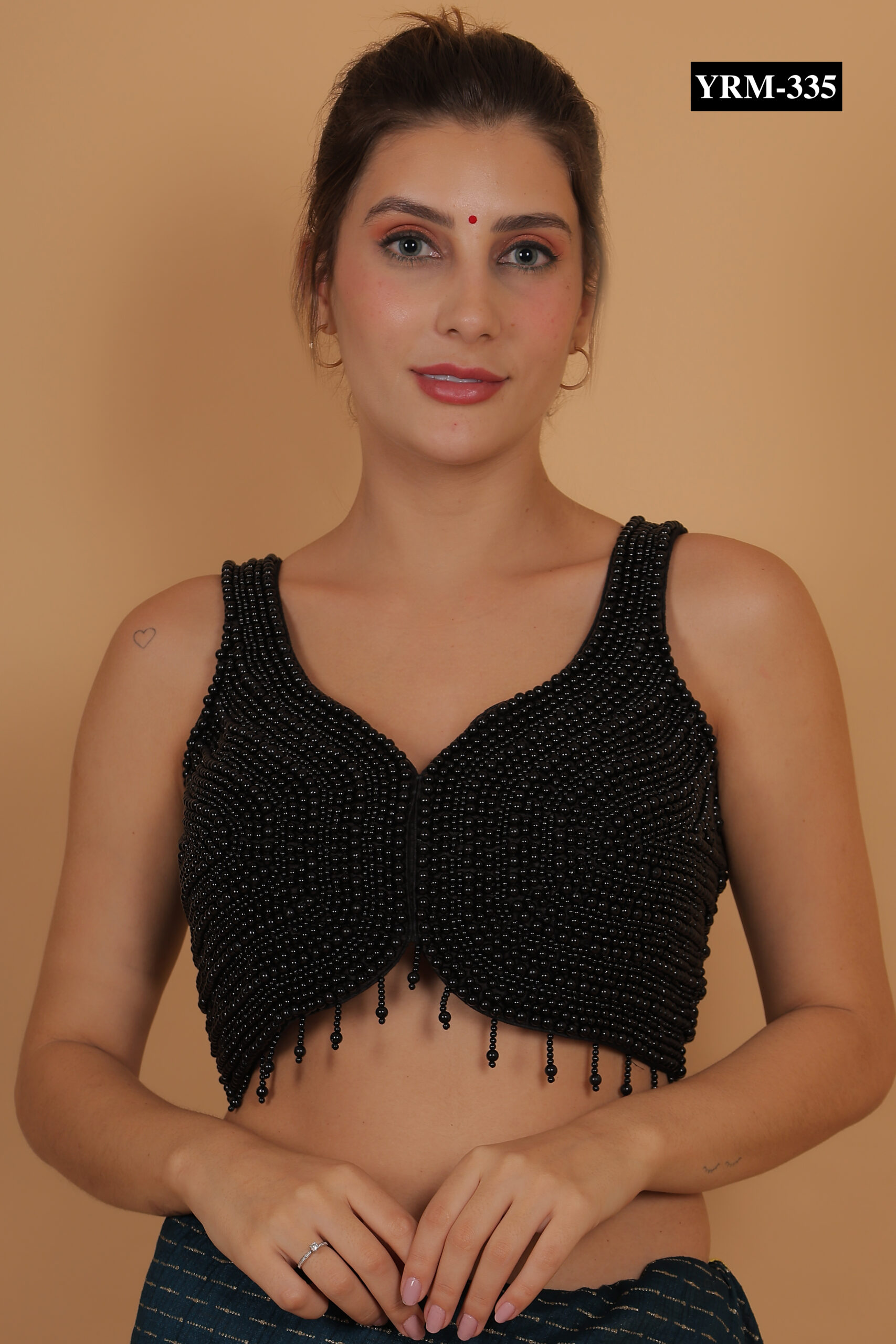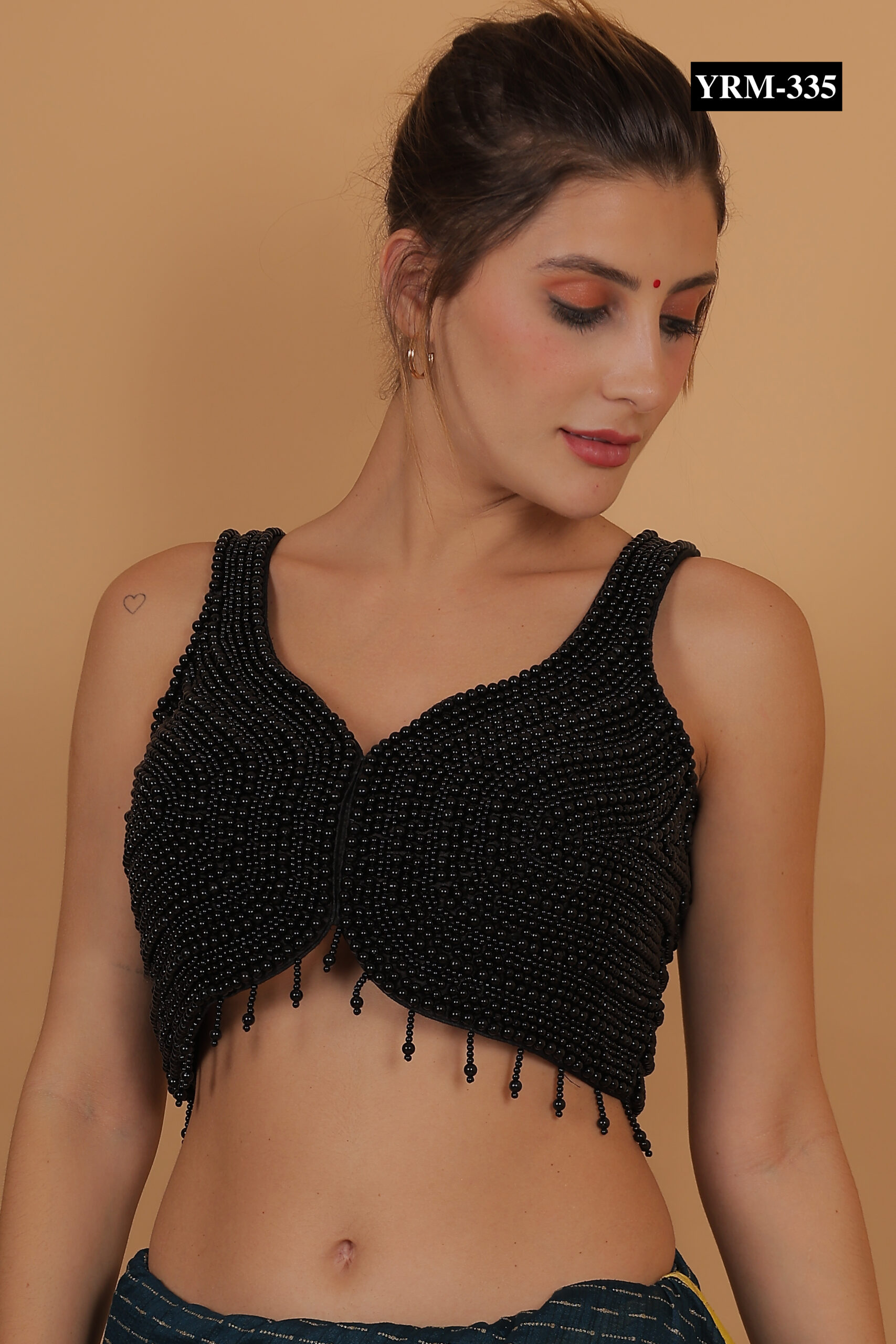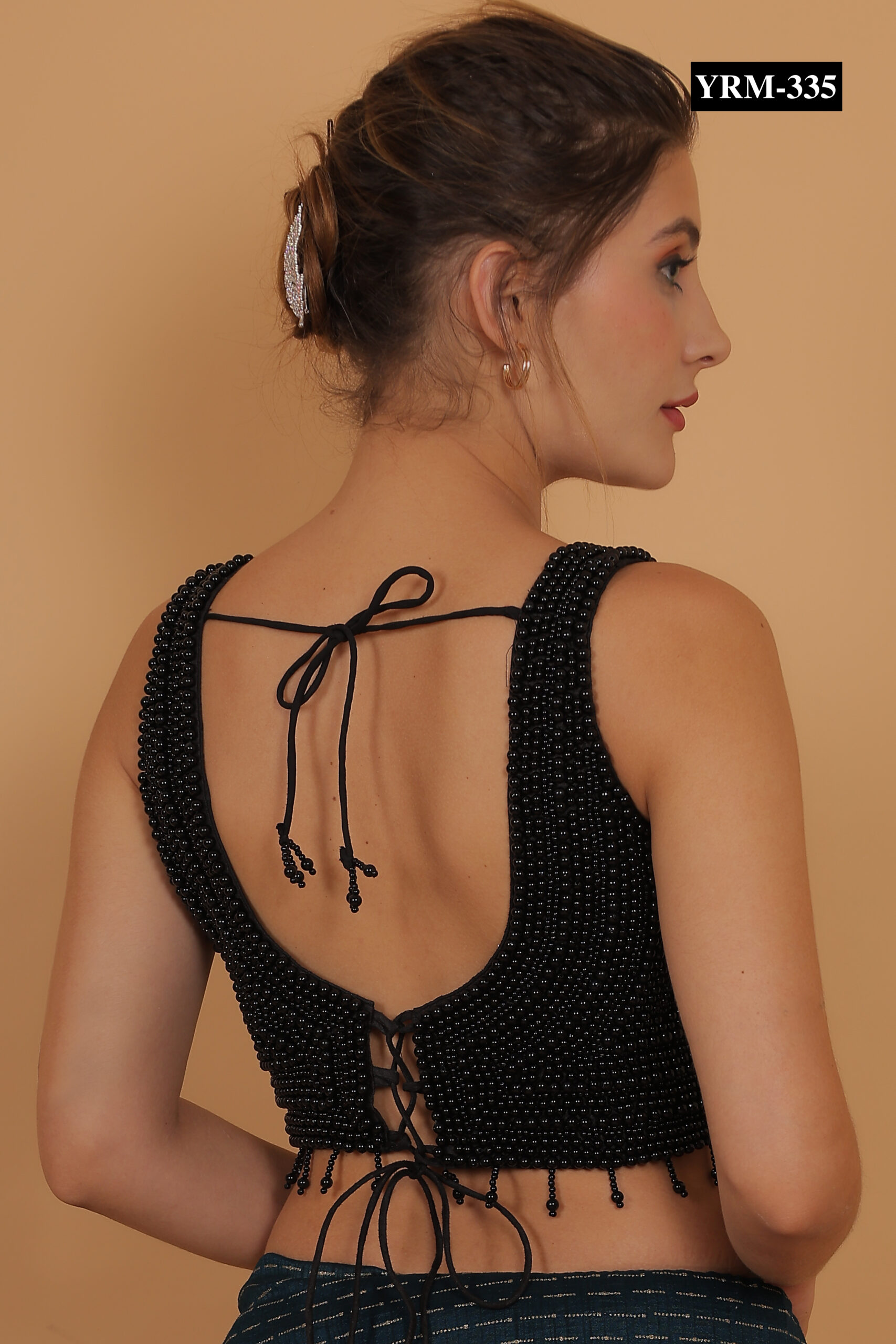 This Black Pearl Corset Top creates a striking contrast when paired with gold, red, or pastel-colored sarees. The pearl embellishments catch light subtly, adding a refined glow to your outfit. Pair it with statement jewelry or minimalist accessories to complete a polished, elegant look.