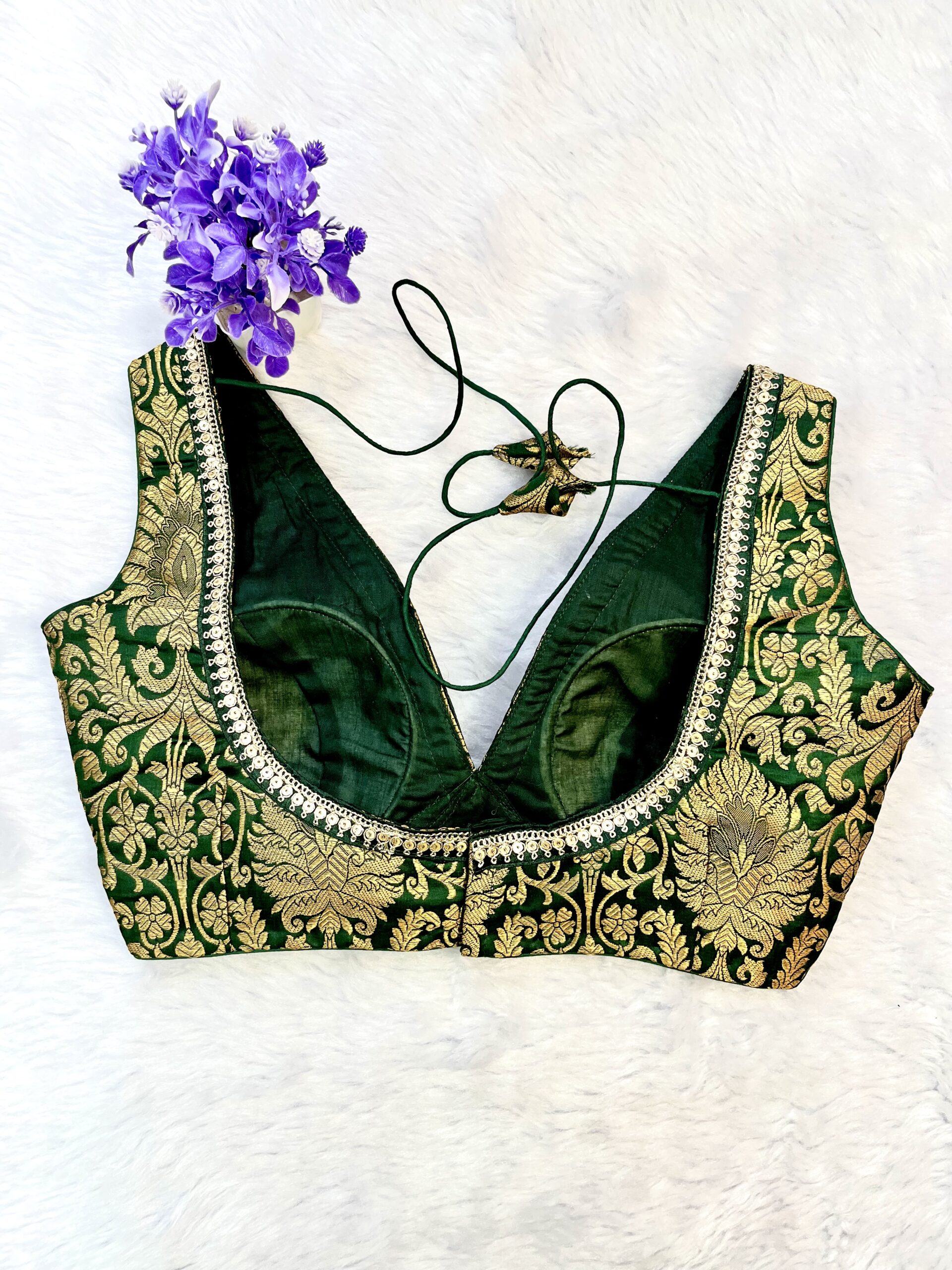 Elevate your ethnic wardrobe with the Bottle Green Banarasi Brocade V-Neck Blouse, a timeless masterpiece that blends luxury with tradition. Crafted from premium Banarasi brocade, this blouse reflects the rich heritage of Indian weaving while offering a modern silhouette through its flattering V-neckline. Moreover, the deep bottle green shade enhances its regal charm, making it a must-have for festive and wedding occasions.