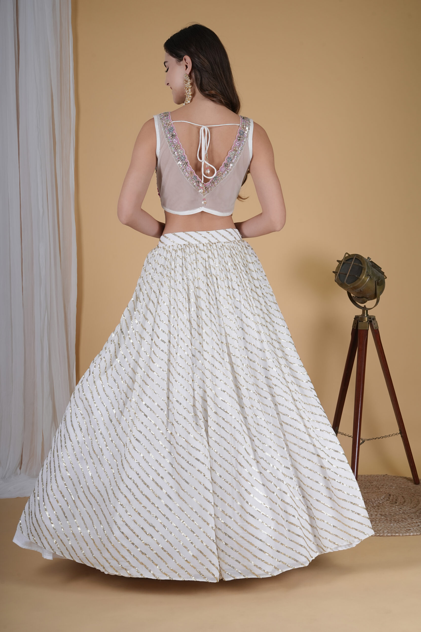 Made from soft, breathable fabric, it ensures comfort without compromising style. The intricate embroidery showcases delicate floral patterns in multiple hues, creating a stunning contrast against the white backdrop. Every stitch reflects finesse, turning this lehenga into a masterpiece of modern Indian design.