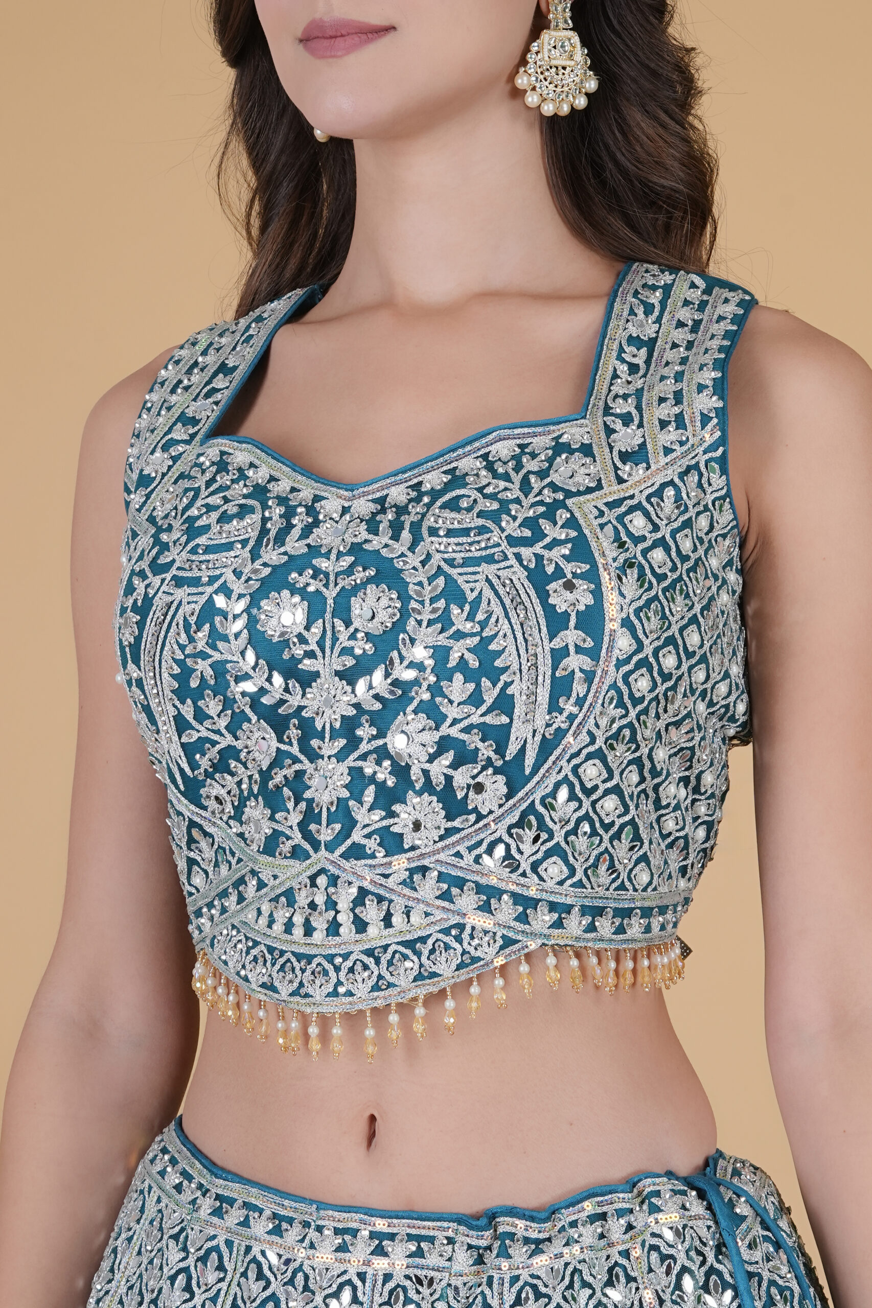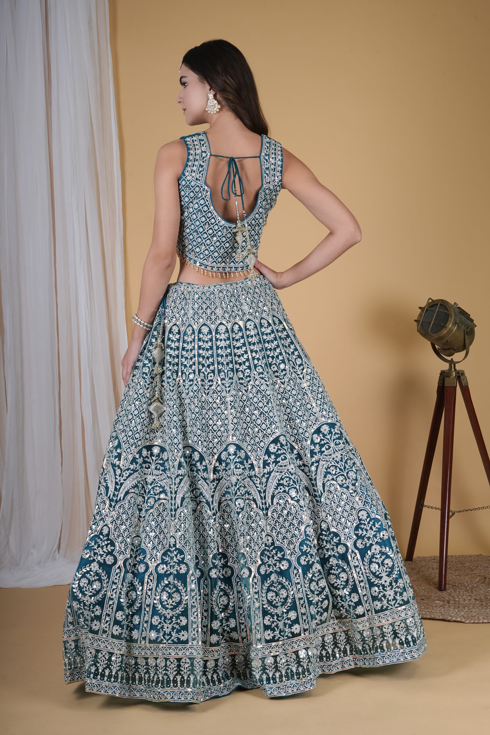 Pair this lehenga with gold or Kundan jewelry to complete a regal look. Its unique teal hue suits both day and night occasions, offering versatility and distinction. Whether you attend a family function or a grand wedding event, this lehenga ensures all eyes stay on you.
