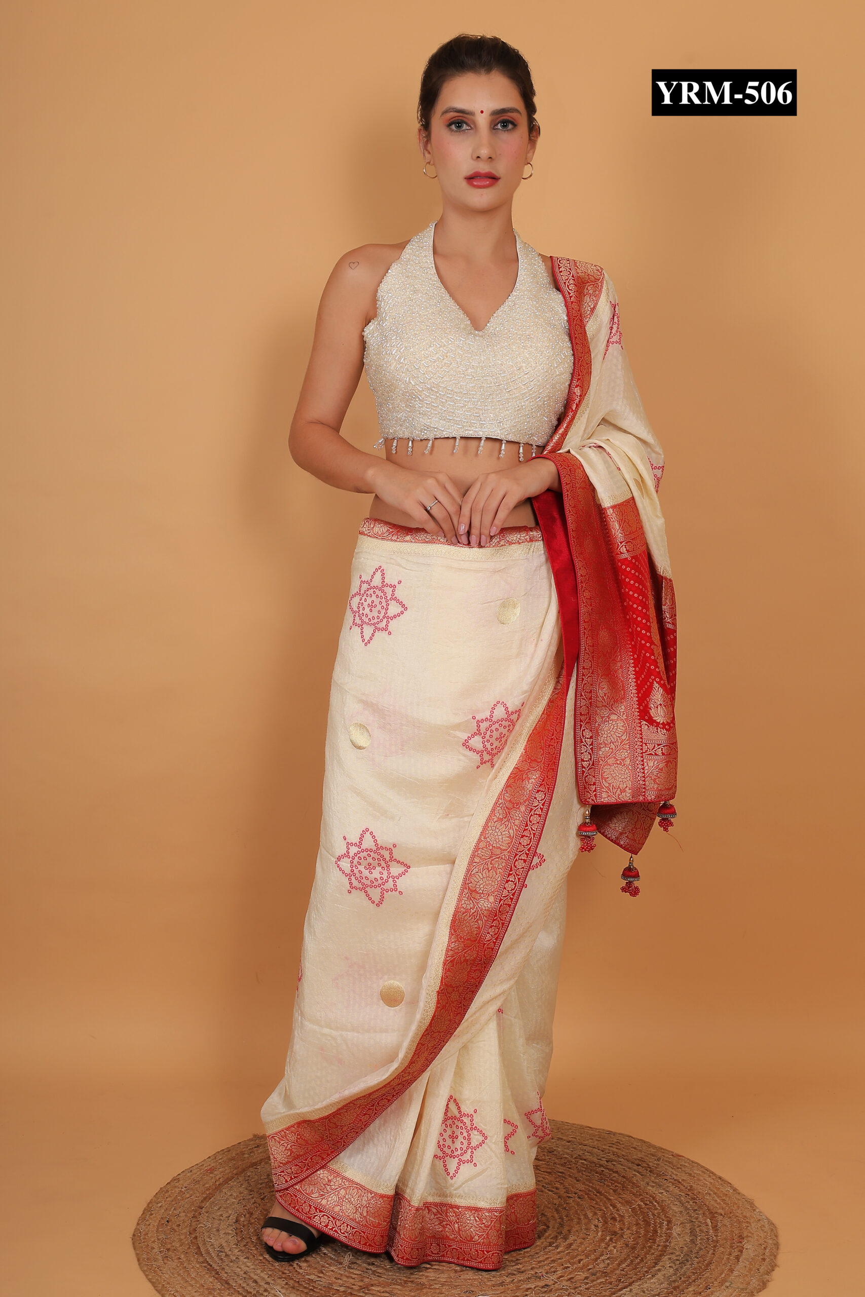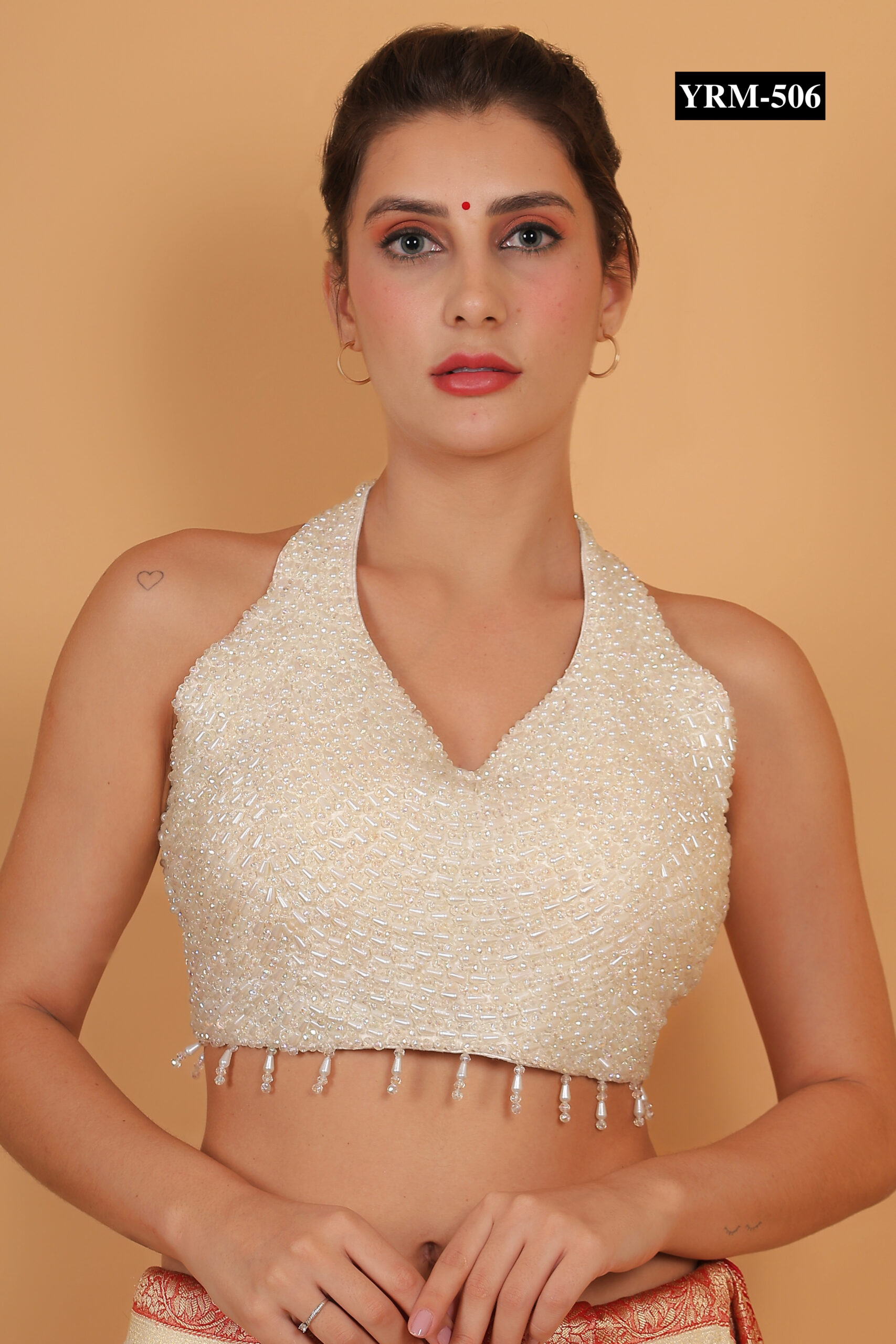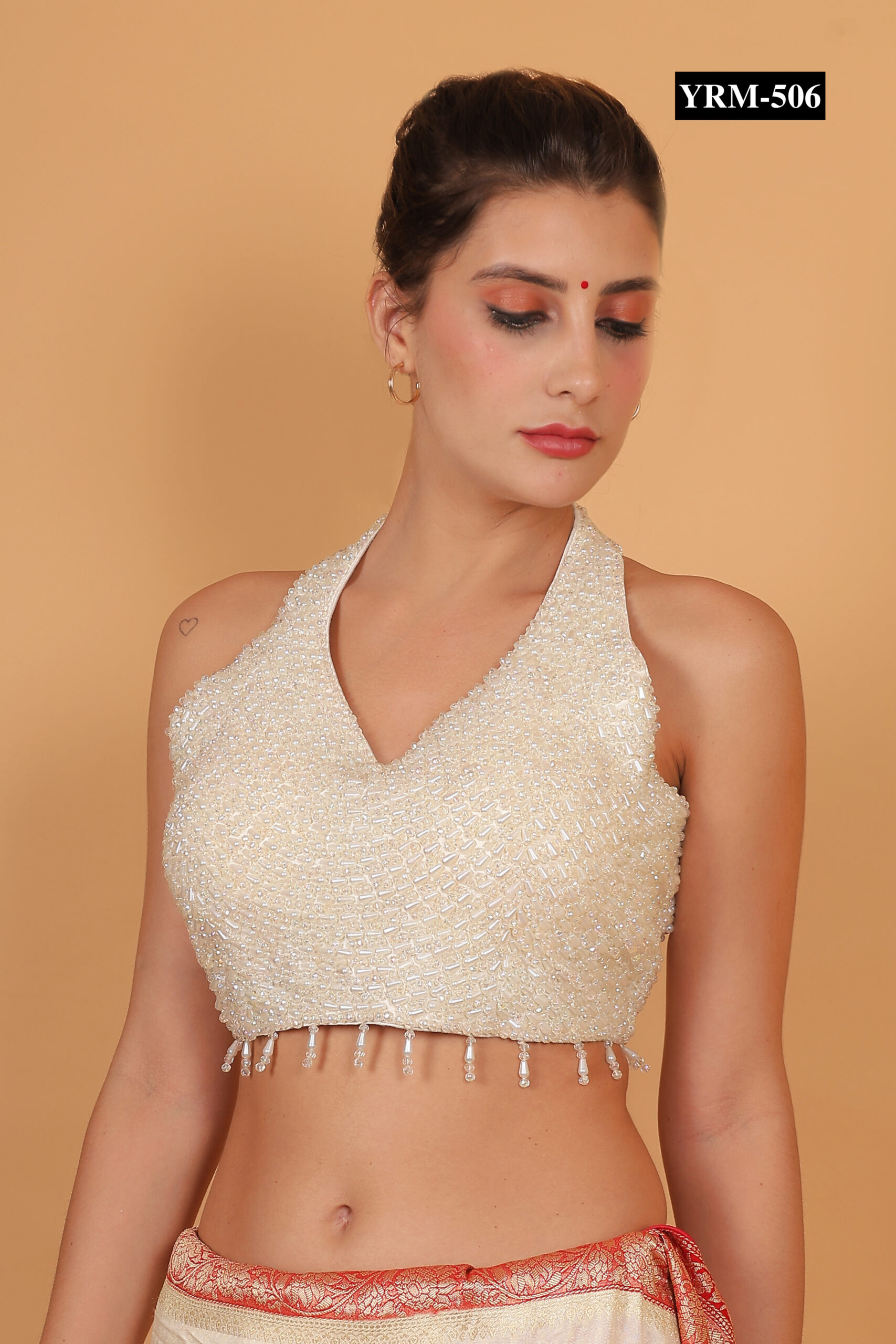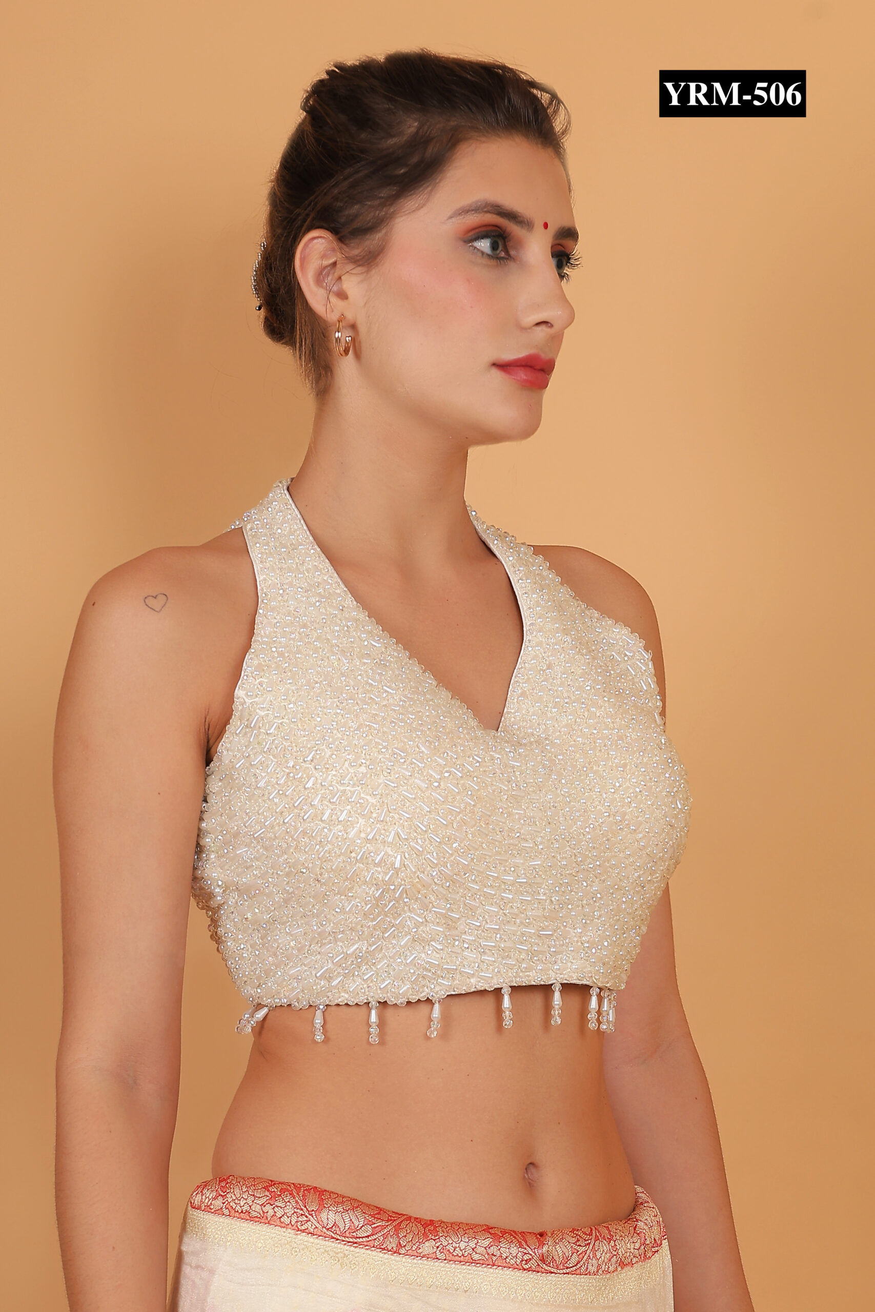 This Trendy White Sleeveless Pearl Blouse pairs seamlessly with pastel, metallic, or contrast-colored sarees for a polished, elegant look. The pearl embellishments catch light subtly, creating a radiant glow. Combine it with statement jewelry for a sophisticated effect or minimal accessories for understated charm.