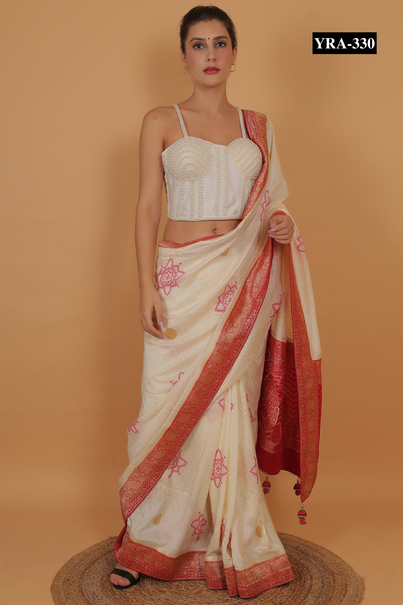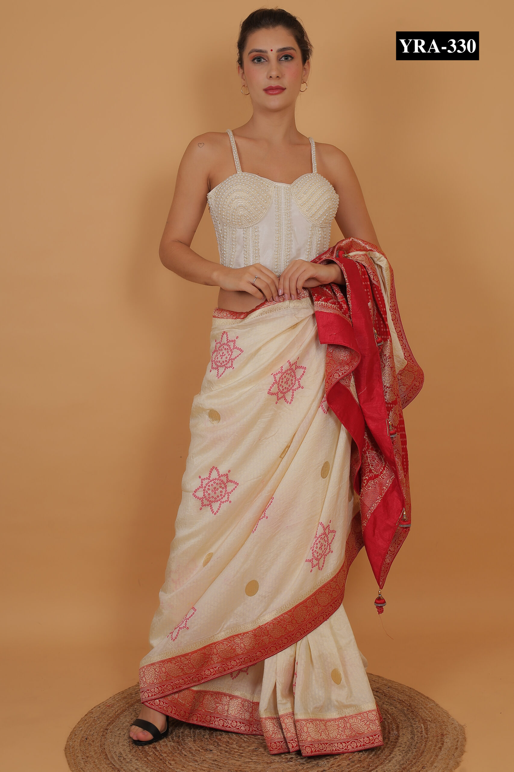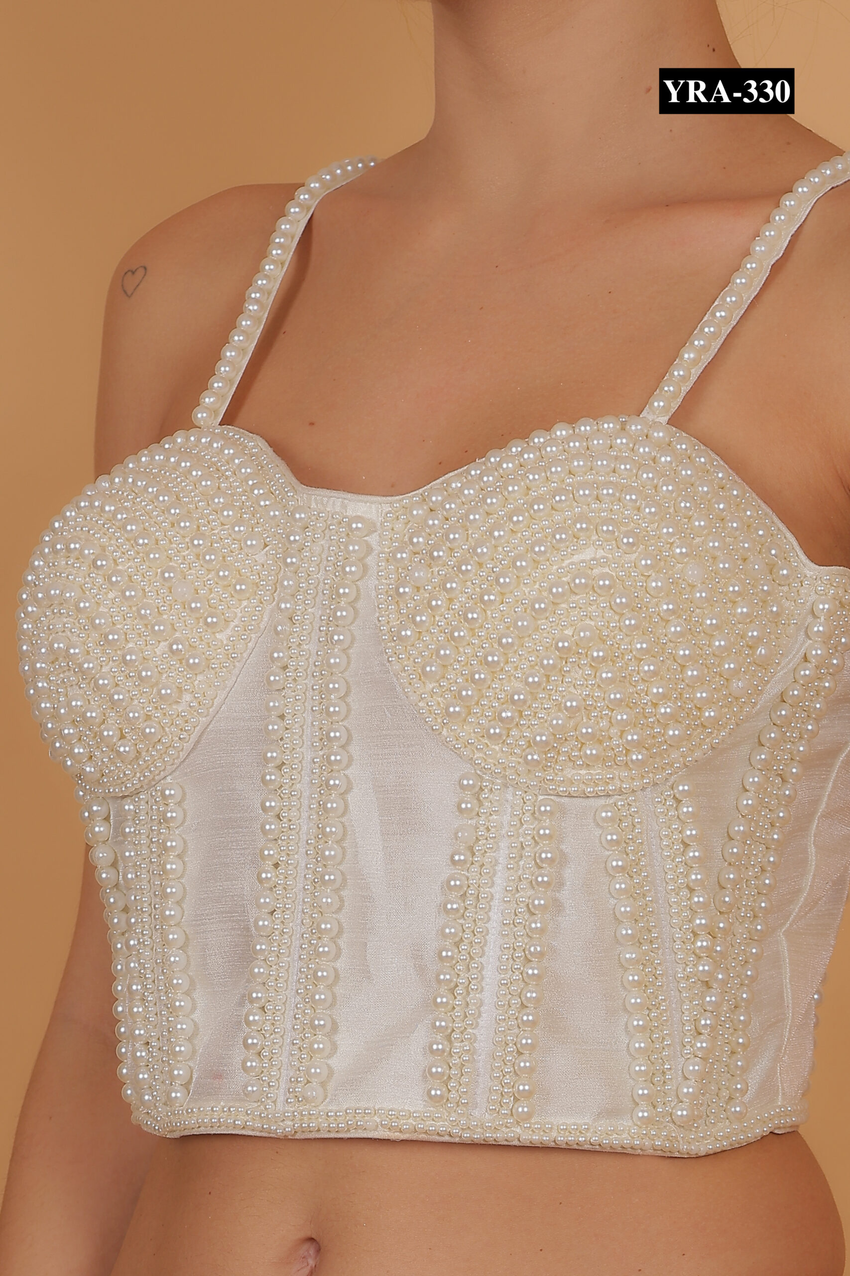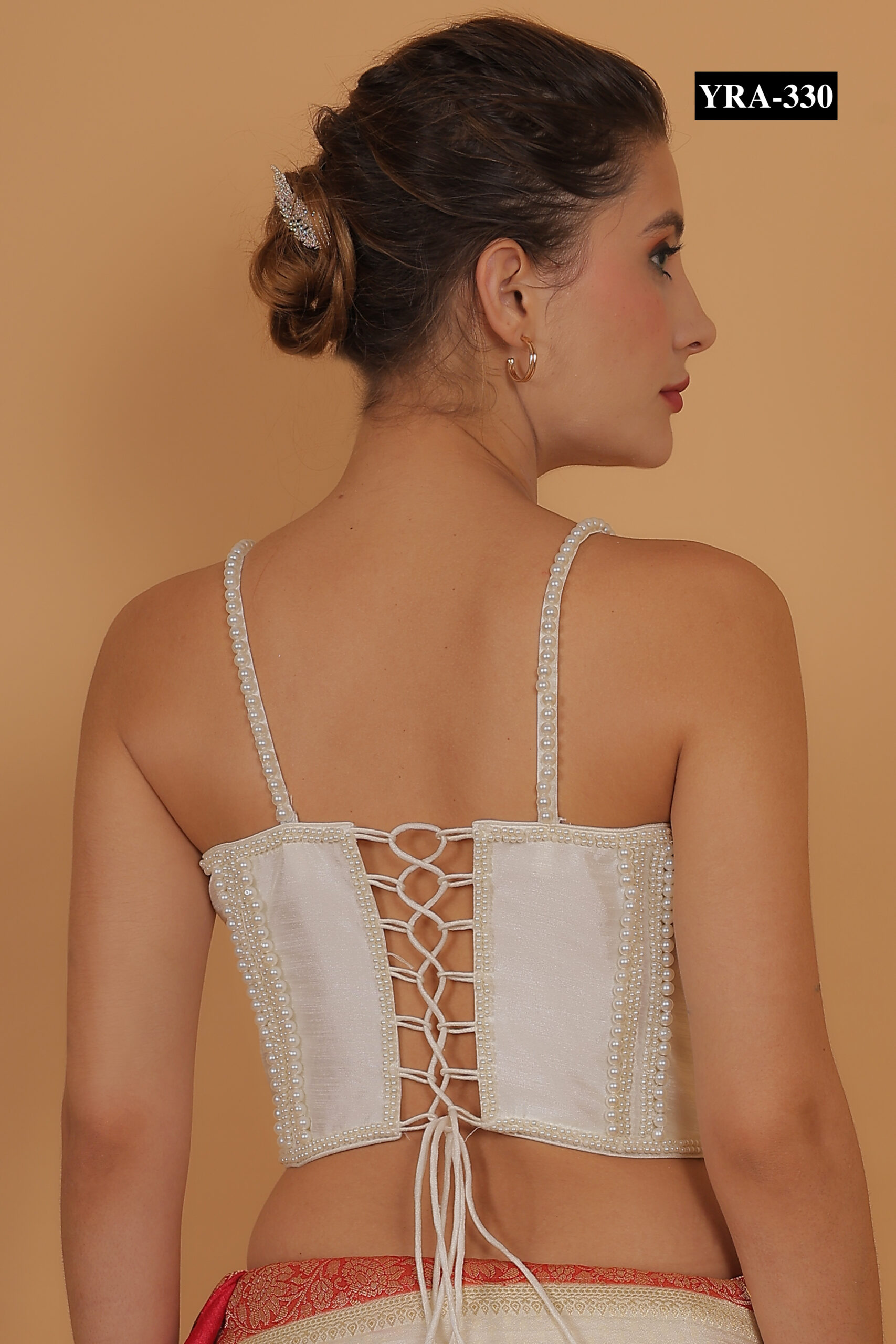Turn every occasion into a style statement with the White Pearl Corset Blouse, a masterpiece that blends sophistication with modern charm. Crafted to perfection, this blouse captures attention with its intricate pearl work and corset-style silhouette that beautifully enhances your natural shape. Ideal for weddings, receptions, or evening celebrations, it adds timeless grace to any ethnic or fusion outfit.