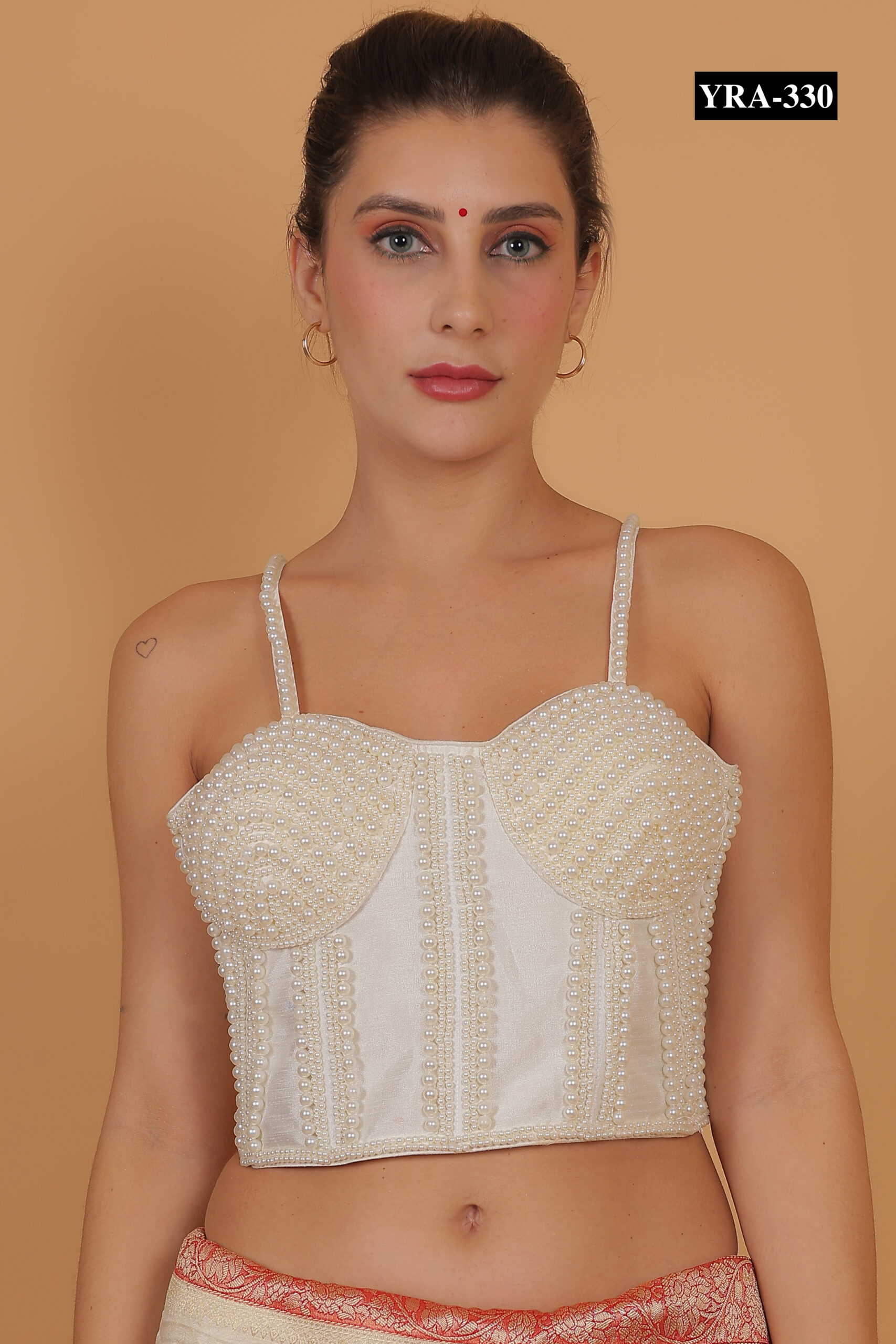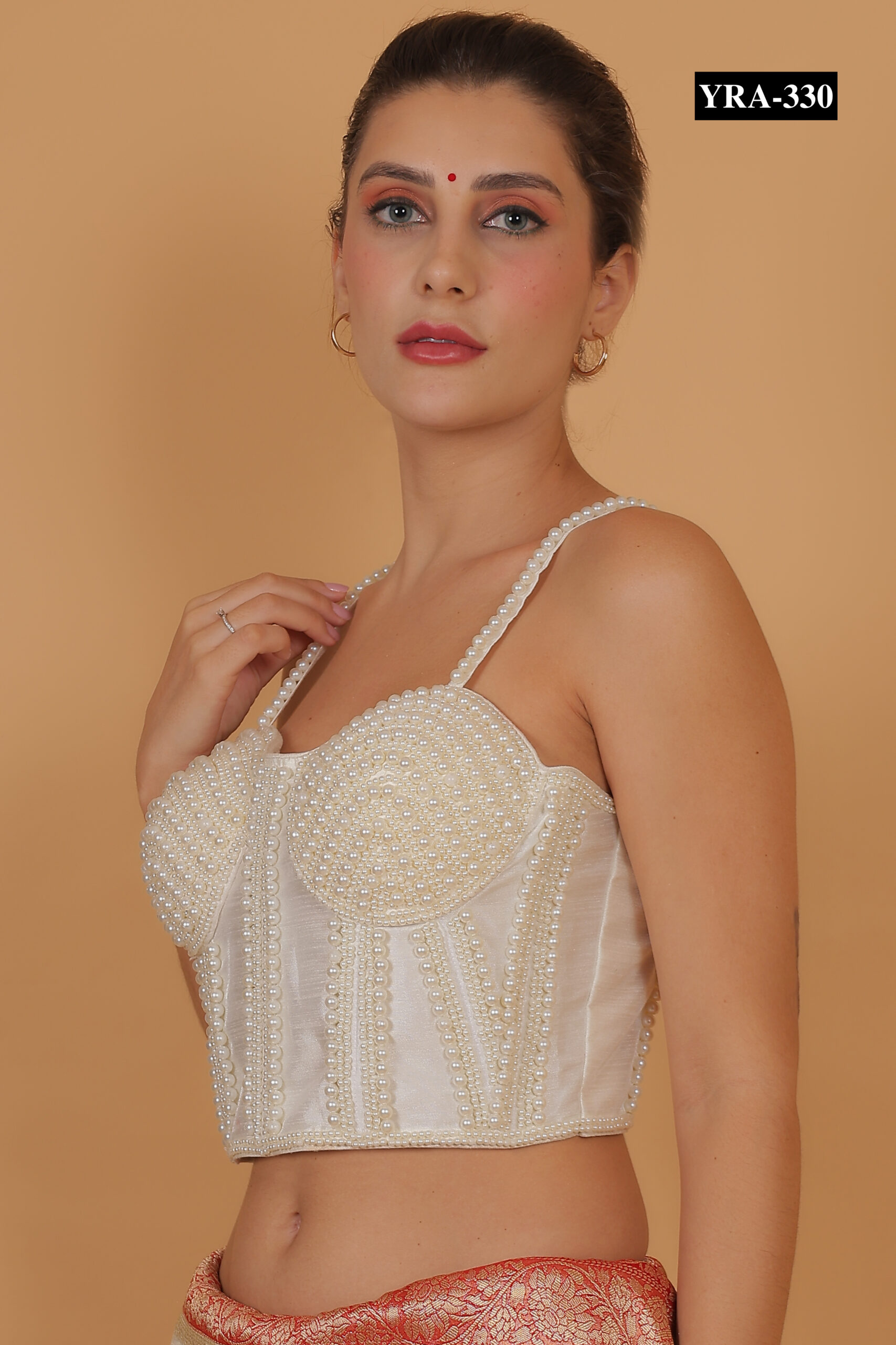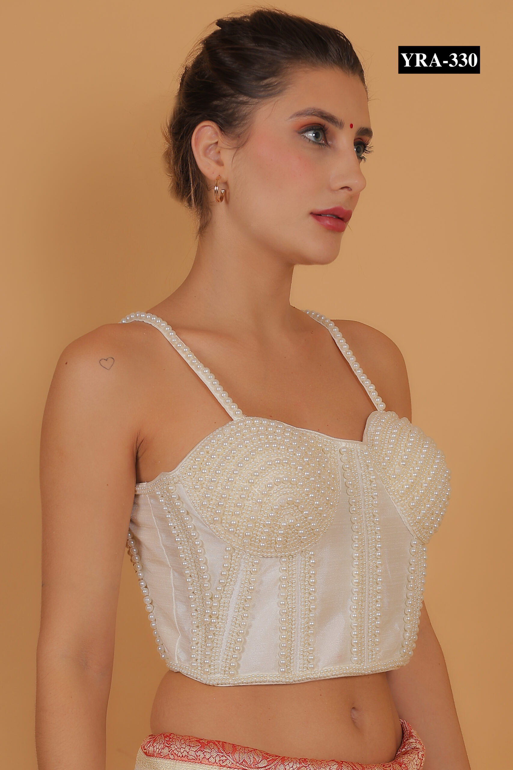 Made from high-quality fabric, it offers a soft, breathable feel that ensures comfort without compromising on elegance. The structured corset fit gives a flattering contour, while the delicate pearl embellishments reflect craftsmanship and luxury. Whether you pair it with a saree, lehenga, or skirt, this blouse brings radiance and refinement to every look.