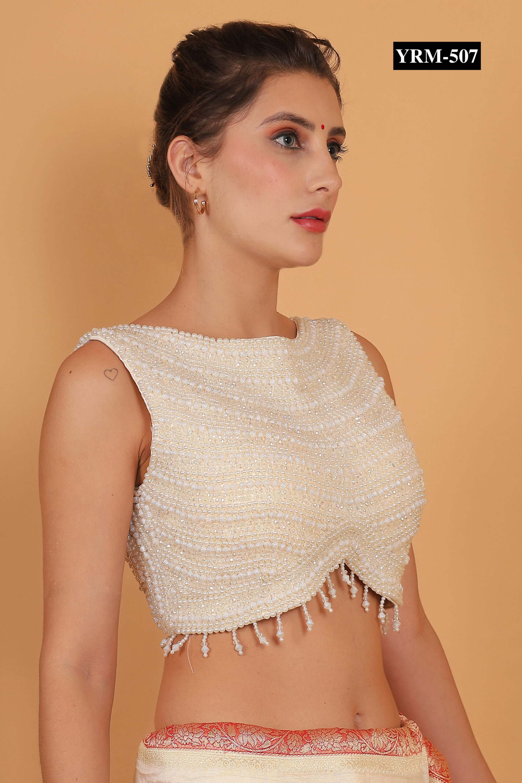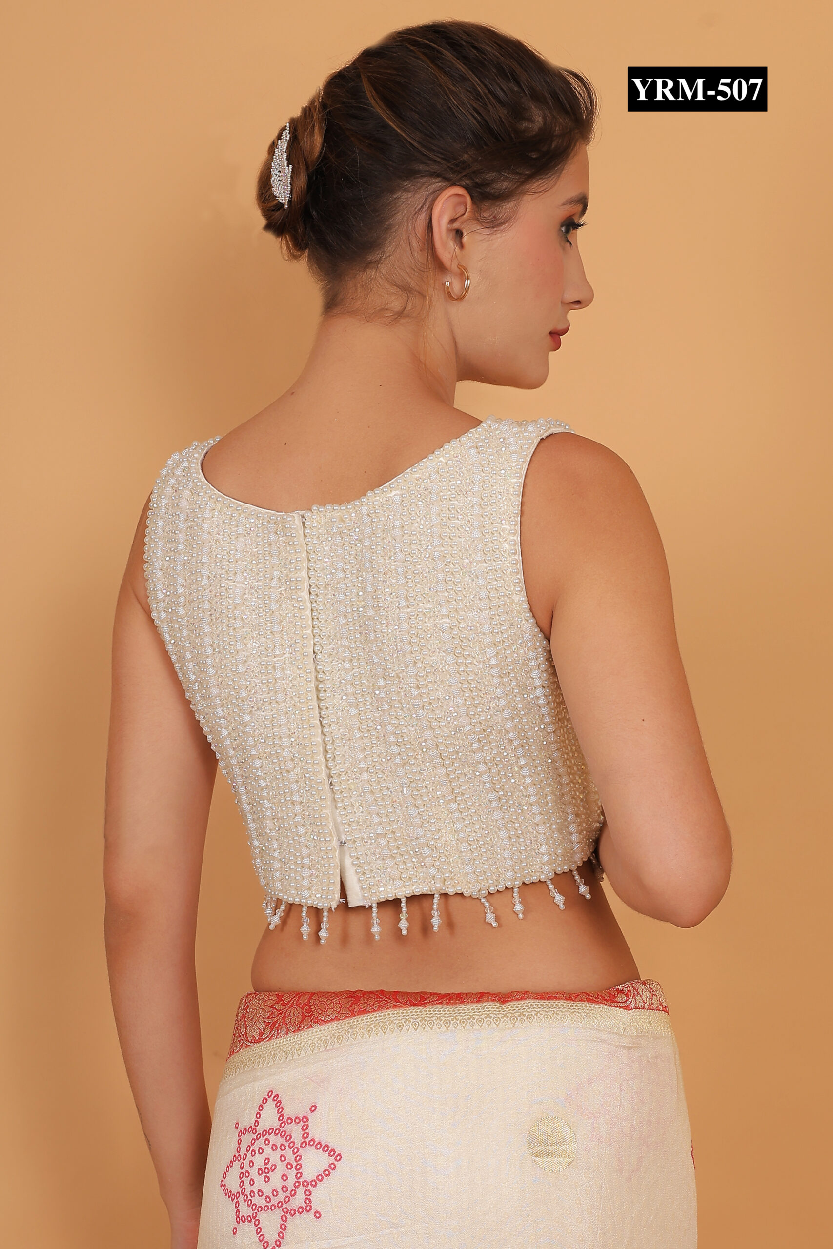 This Wrapped White Pearl Saree Top pairs beautifully with silk, chiffon, or georgette sarees. The pearls reflect light subtly, creating a radiant glow that elevates your overall ensemble. Accessorize with statement earrings or minimal jewelry depending on your desired look.