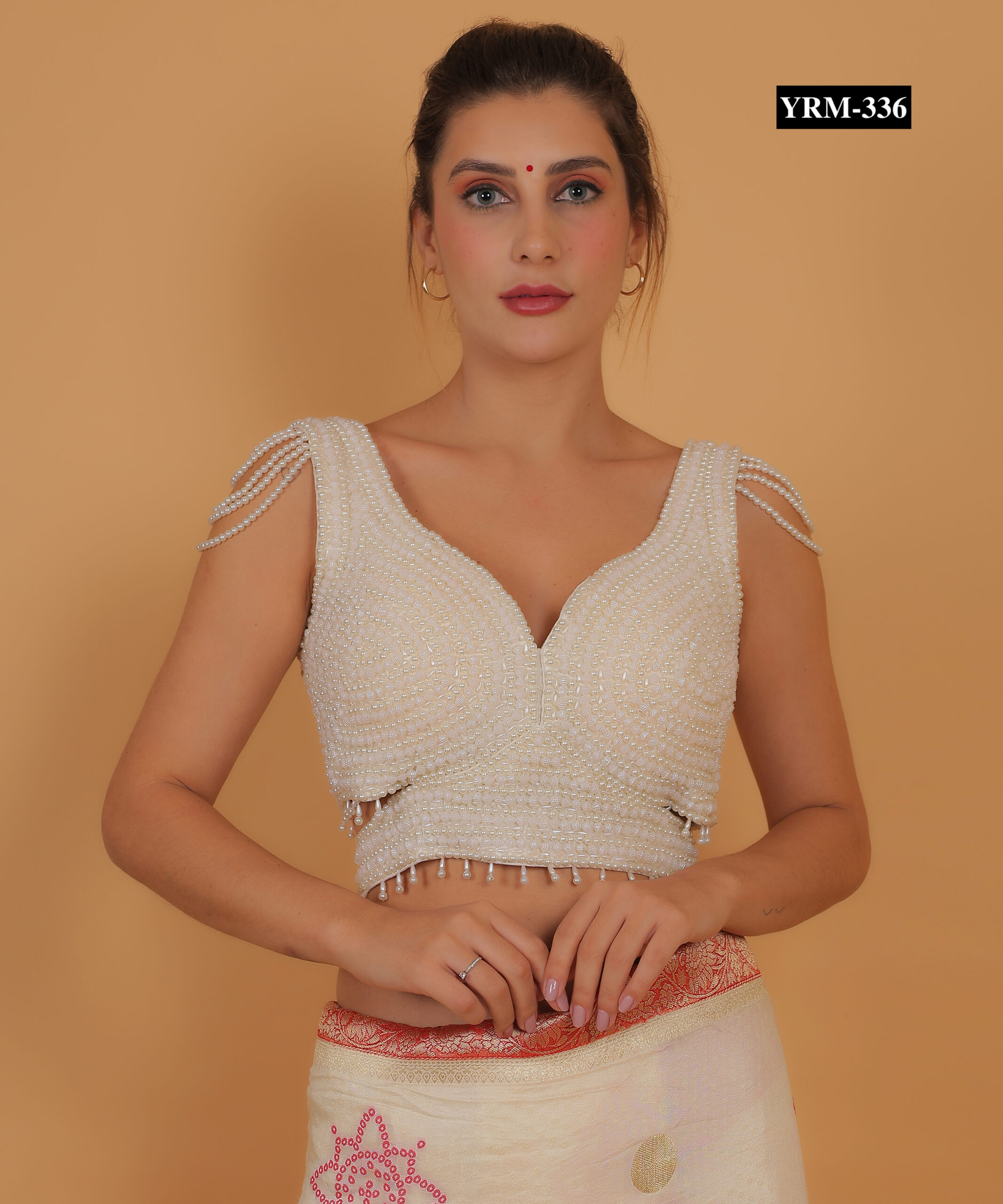 Style this White Pearl Belted Blouse with a pastel, cream, or contrast-colored saree for an effortlessly chic look. The belt detail allows for adjustable fit and adds a contemporary touch to the traditional pearl embellishments. Pair it with statement jewelry for a polished, sophisticated finish.